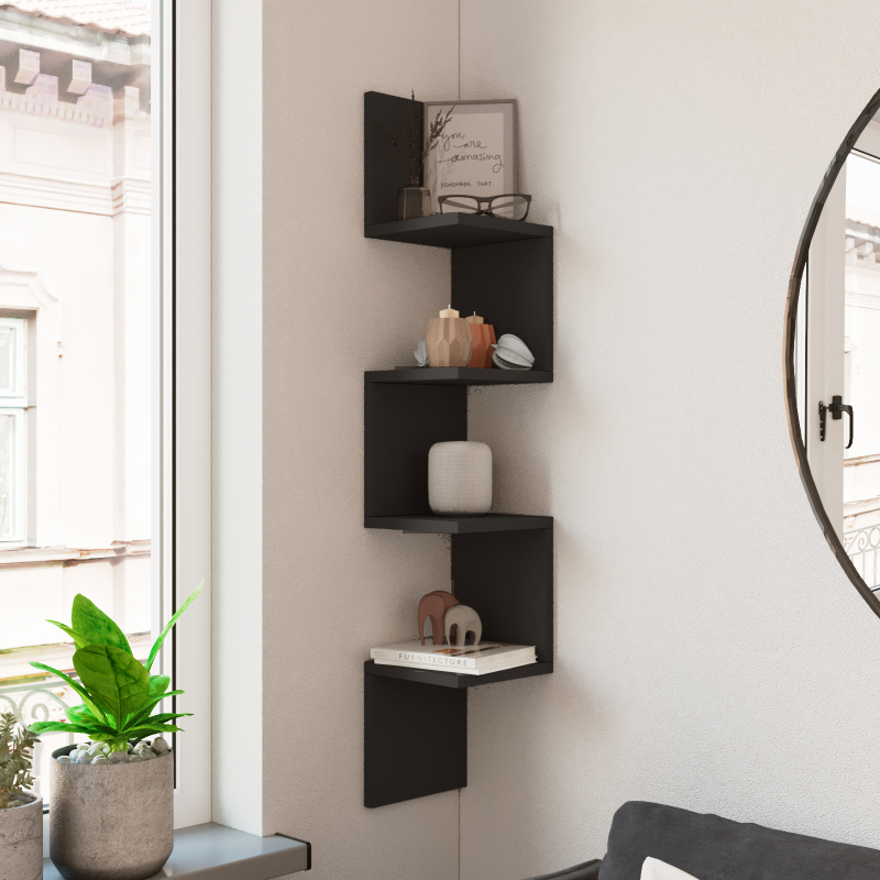 יחידת מדפים פינתית המונה 4 מדפים קטנים בעיצוב אסימטרי. משתלבת נפלא בכל חדר במשרד או בבית.