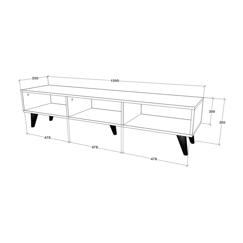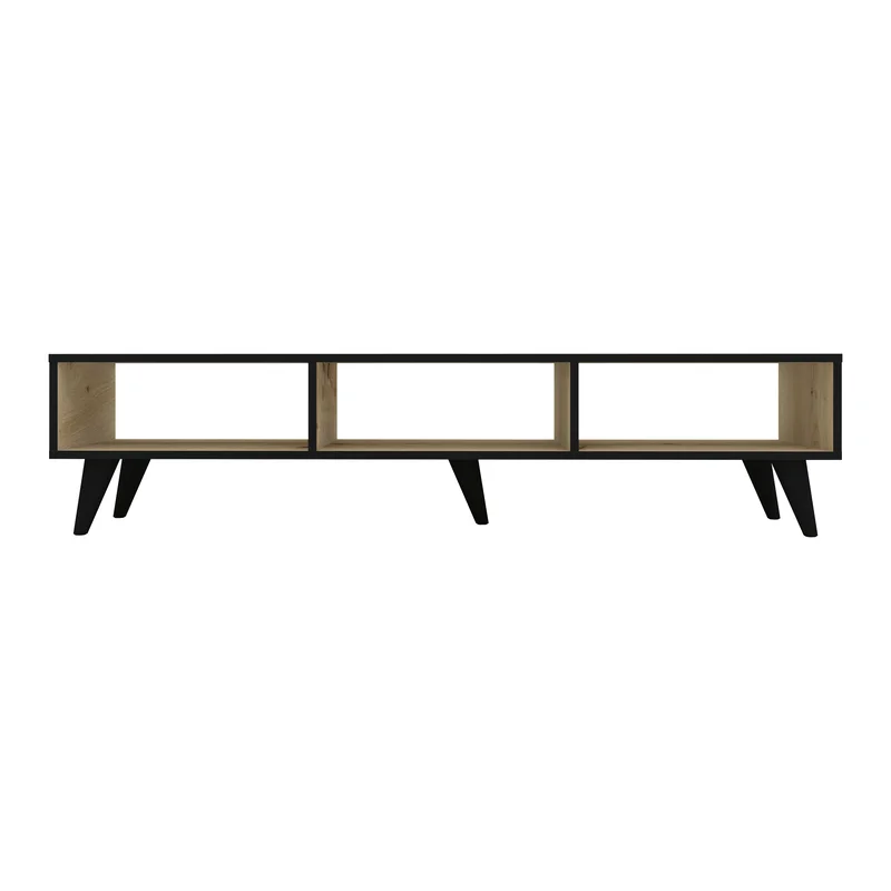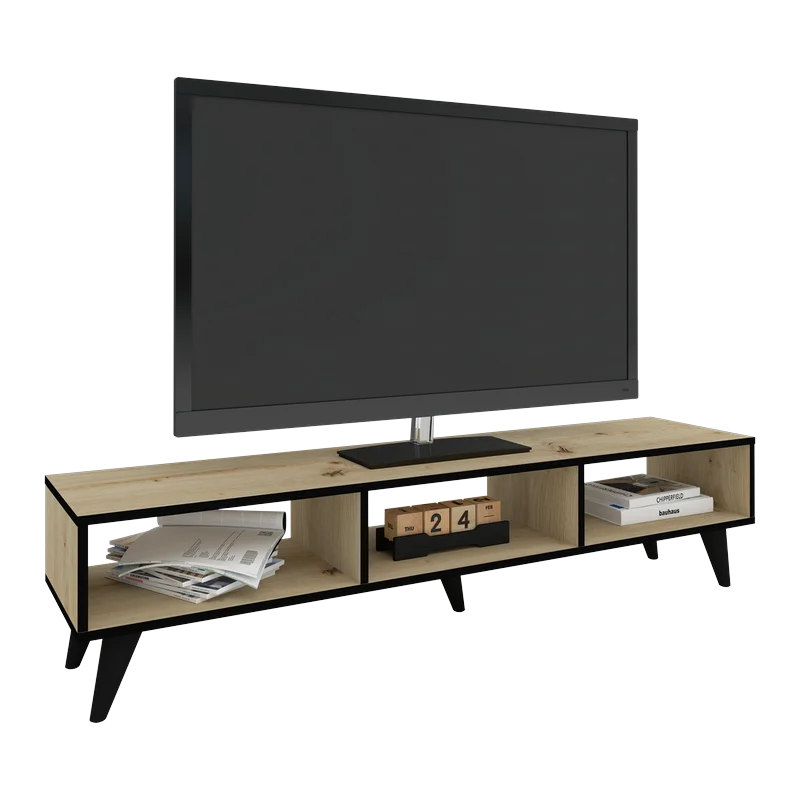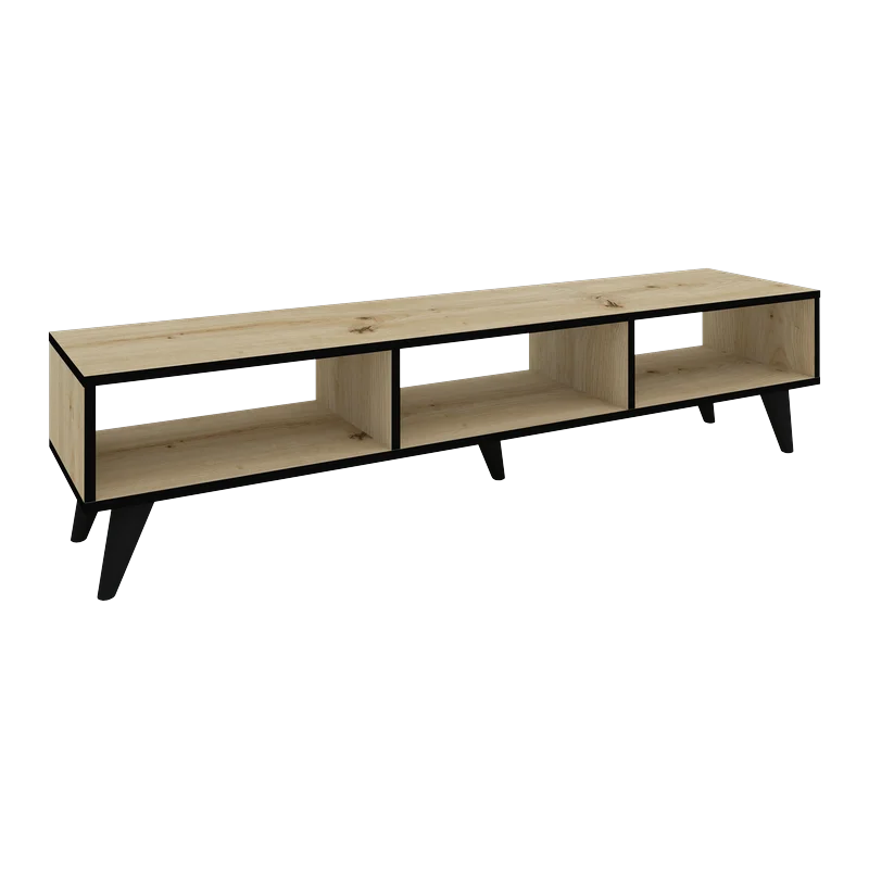 מזנון טלוויזיה מינימליסטי עם שלושה תאי אחסון. עשוי עץ תעשייתי בגוון אלון, רגלי PVC, מושלם לסלון בסטייל נקי.