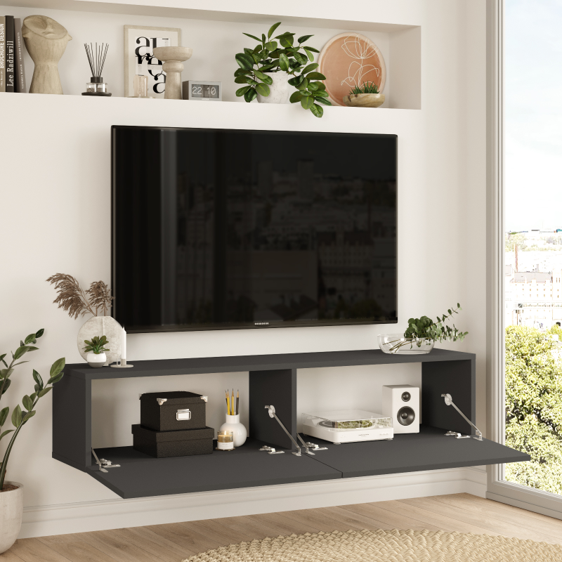 מזנון טלוויזיה מרשים בעיצוב מודרני ועכשווי במגוון צבעים לבחירה. המזנון הינו מזנון צף הממוקם מתחת לטלוויזיה ובעל שתי קלאפות לאחסון