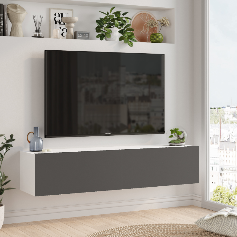 מזנון טלוויזיה מרשים בעיצוב מודרני ועכשווי במגוון צבעים לבחירה. המזנון הינו מזנון צף הממוקם מתחת לטלוויזיה ובעל שתי קלאפות לאחסון