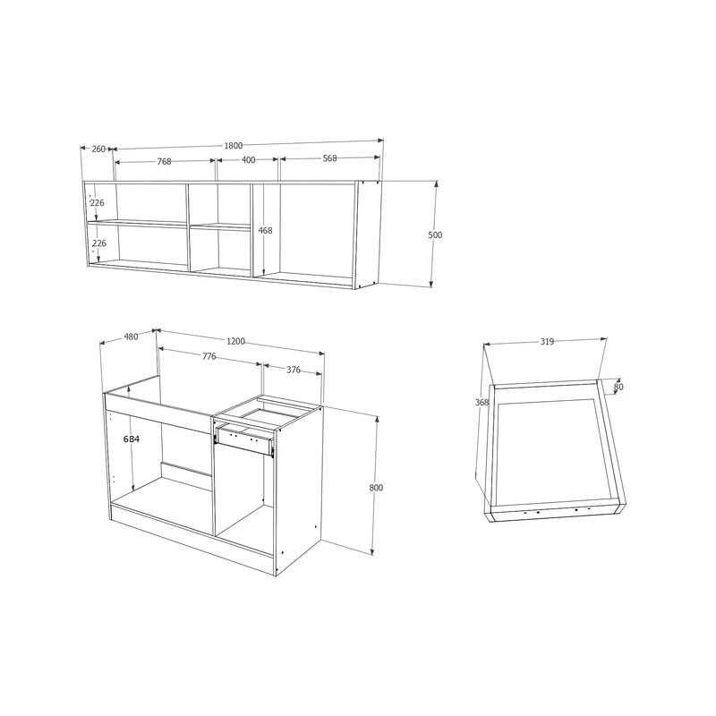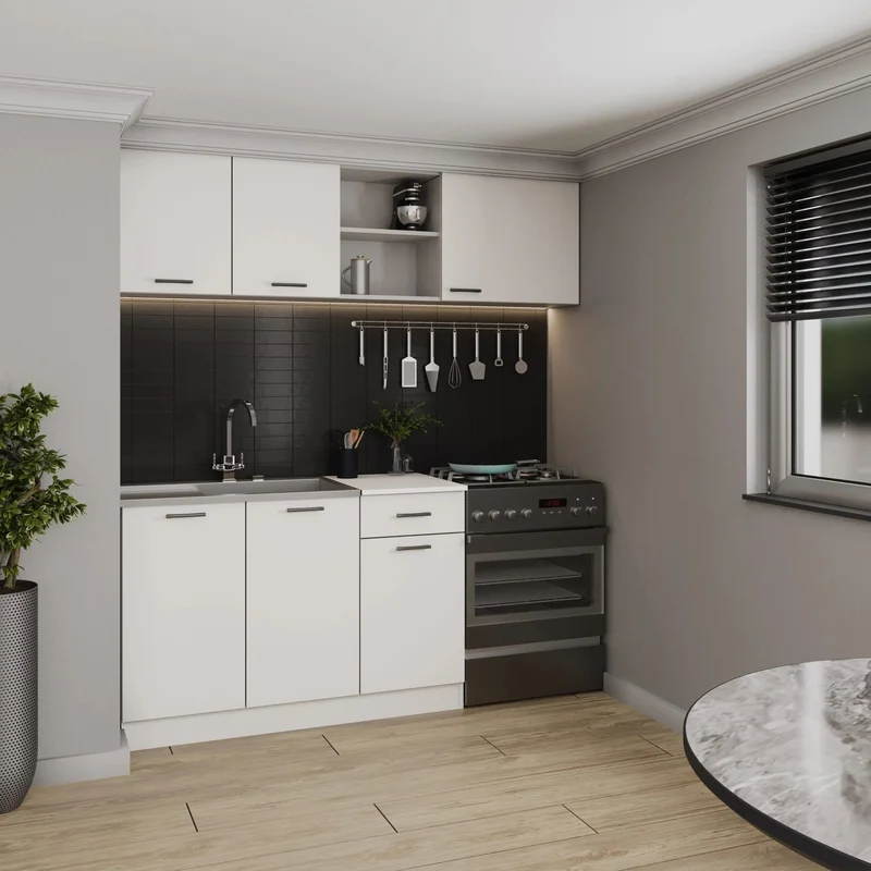מטבח לבן מודרני, עיצוב קומפקטי לחללים קטנים. ארונות אחסון מרווחים, כיור נירוסטה ומשטח עבודה פרקטי. ידיות שחורות אלגנטיות, קל להרכבה, מושלם כעמדת קפה או מטבח ליחידת דיור.