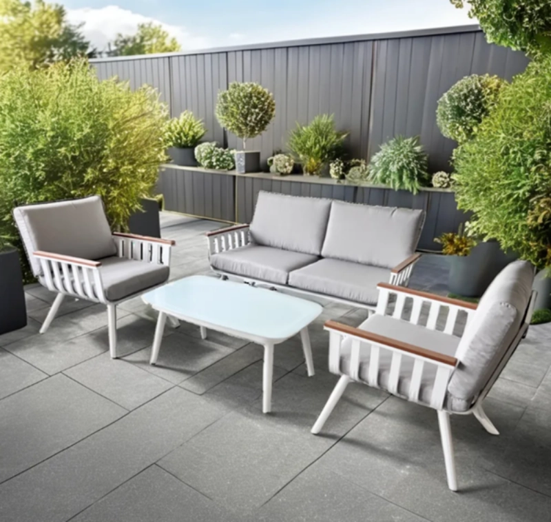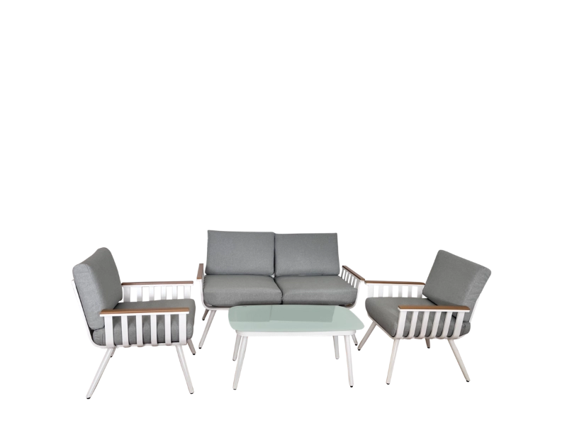 מערכת ישיבה אלומיניום דו מושבית דגם אנגליה לבן – סט יוקרתי הכולל שתי כורסאות יחיד, ספה דו מושבית ושולחן זכוכית. בגימור לבן עם כריות אפורות בהירות, משלב שלדת אלומיניום ודמוי עץ POLYWOOD.
