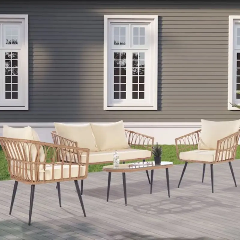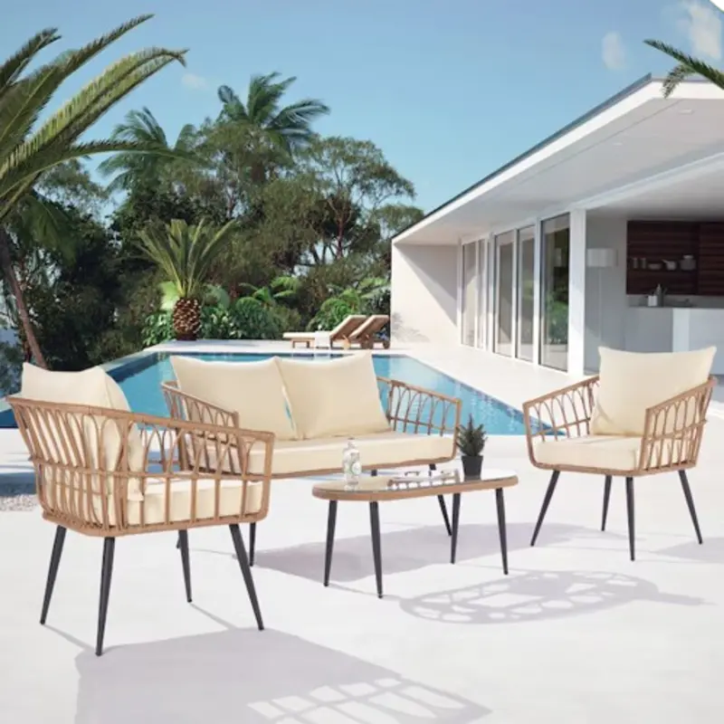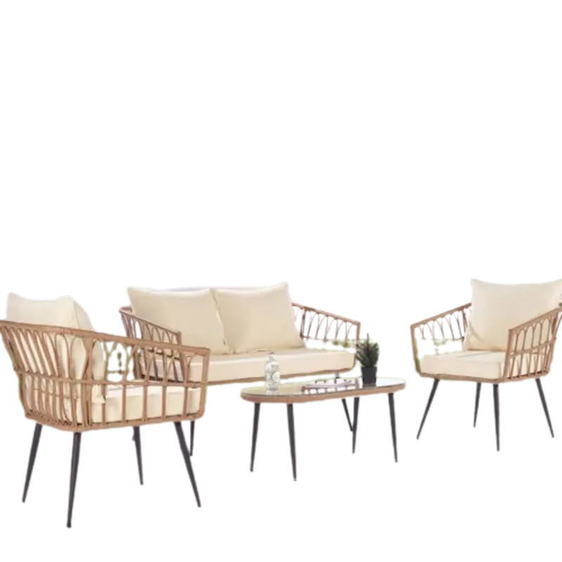 מערכת ישיבה לגינה מעוצבת דגם מורנו – סט יוקרתי המשלב שלדת אלומיניום עם קש קלאסי. כולל ספה זוגית, שתי כורסאות יחיד ושולחן זכוכית. מעוצב בגימור קש טבעי עם כריות שמנת ורגליים שחורות.