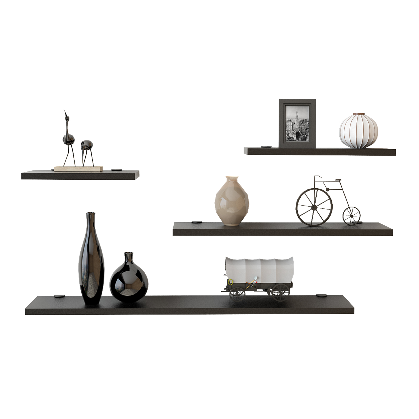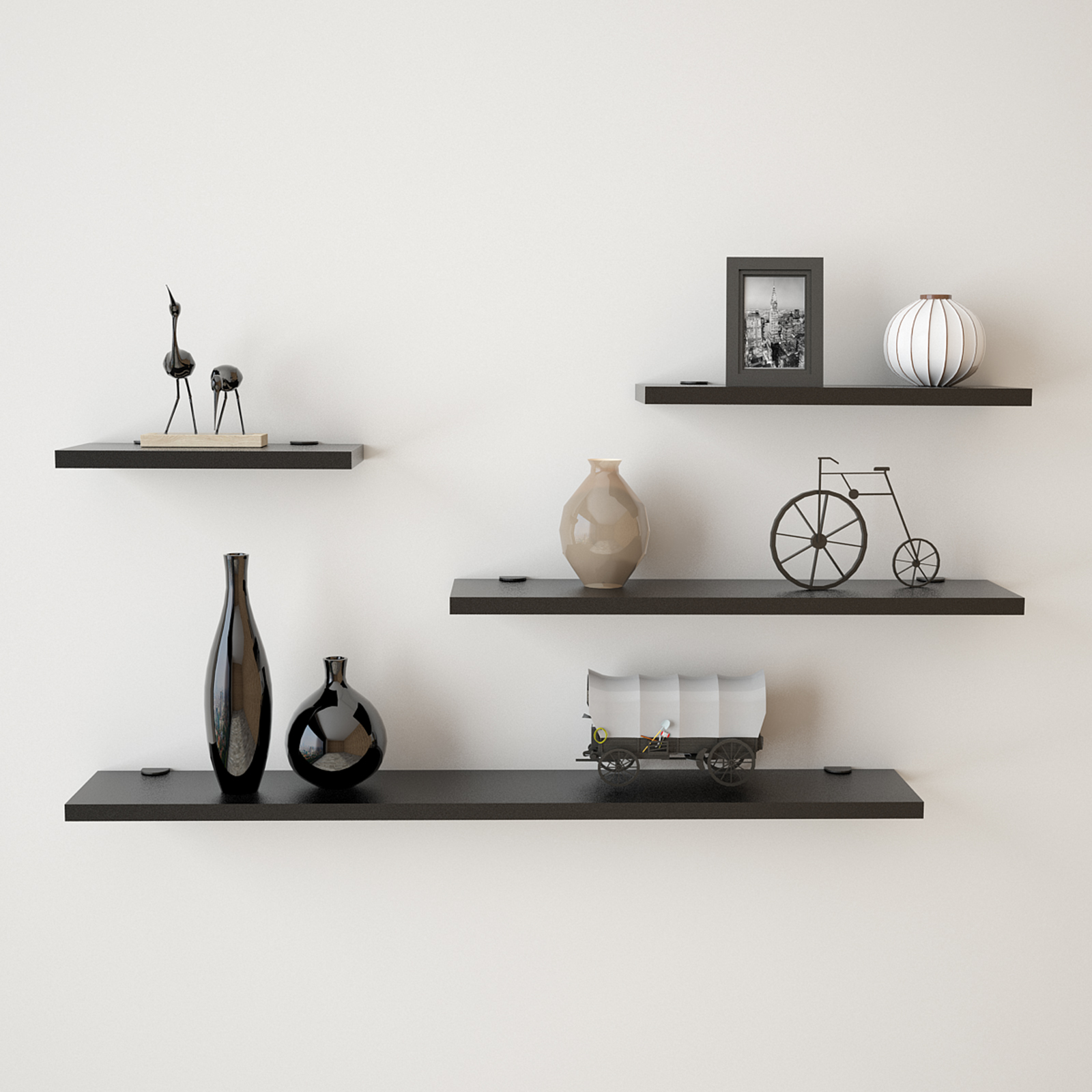 רביעיית מדפים צפים באורכים שונים לעיצוב חלל הבית. המדפים משתלבים נפלא בכל חדר במשרד או בבית, מהסלון דרך חדרי השינה.