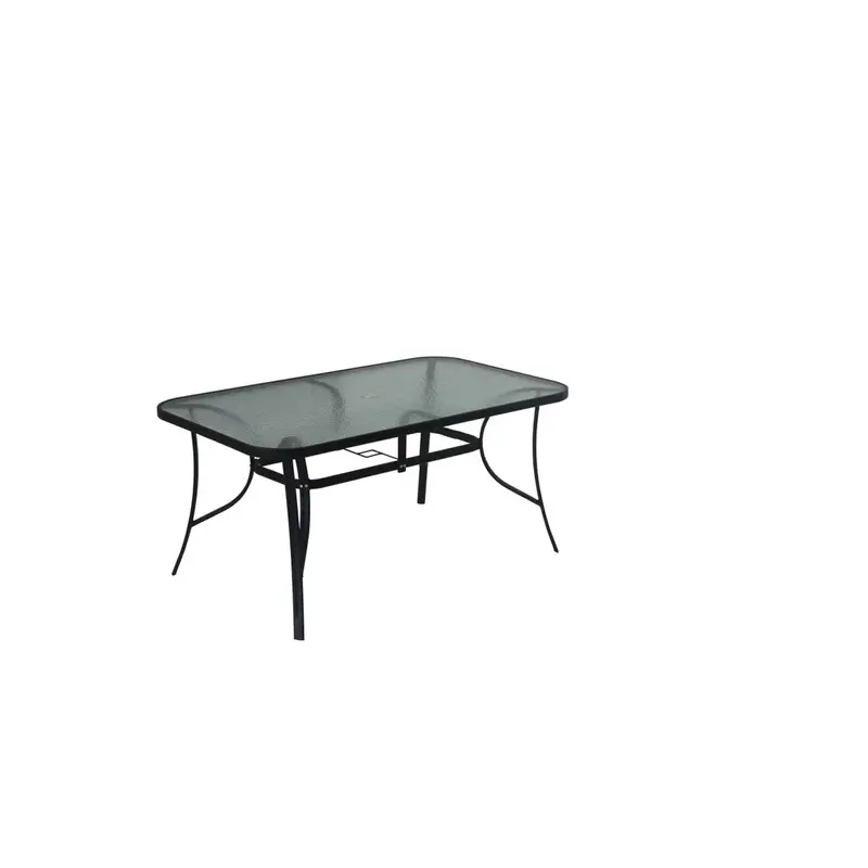 שולחן אוכל לגינה דגם ברצלונה – שולחן זכוכית מחוסמת מעוצב למרפסת וגינה. בגימור שחור אלגנטי עם פתח מובנה לשמשייה, מושלם לאירוח ולשימוש יומיומי.