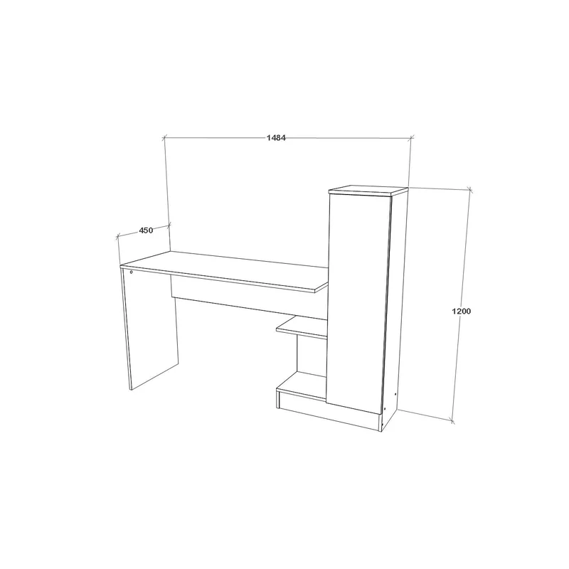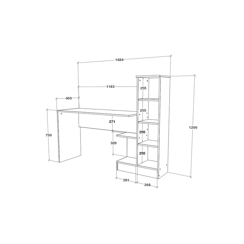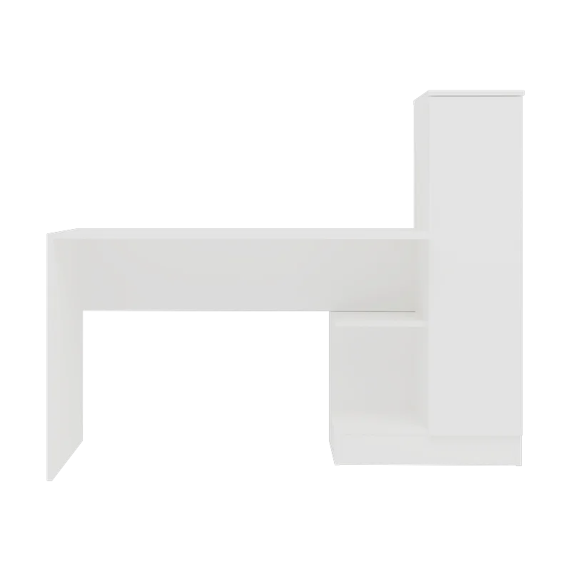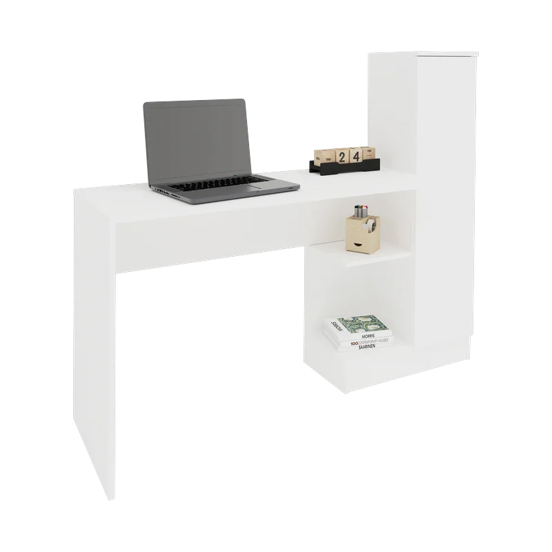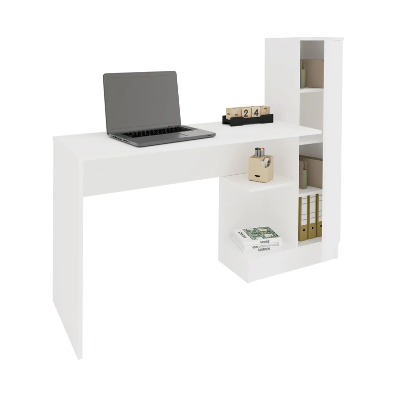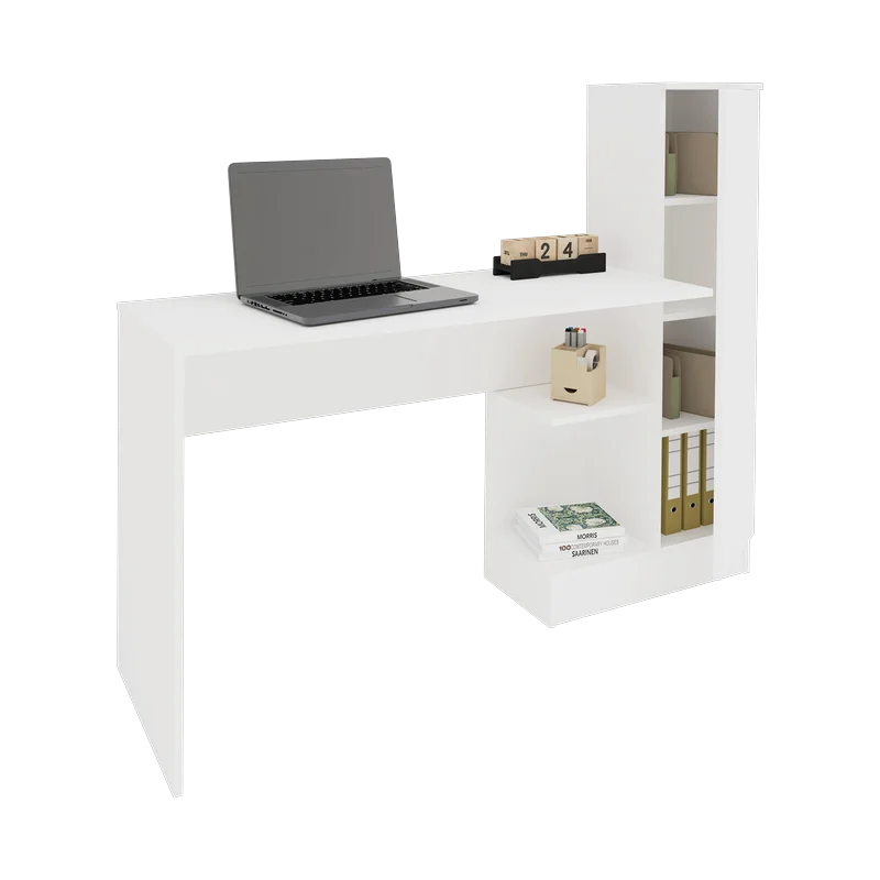 שולחן כתיבה מעוצב עם ארונית צד וארבעה מדפים. עשוי עץ תעשייתי בגוון לבן, מוסיף סטייל ופונקציונליות לחדר עבודה או לימודים.